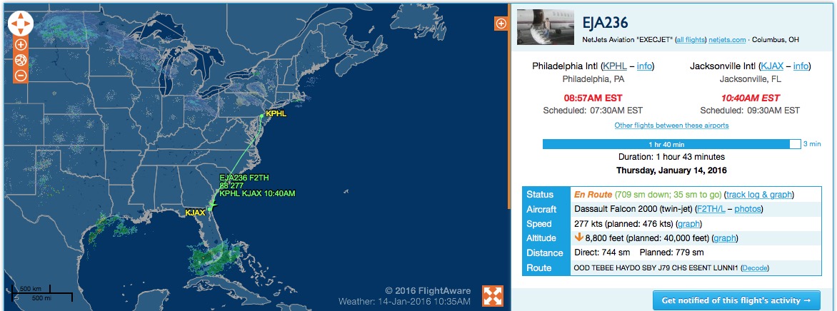 Coughlin has a house in Jacksonville, and reader Deez may have spotted the flight carrying the Eagles search party to Jacksonsville to meet with Coughlin in person– this one: