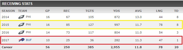 Yeah, he only found the end zone three times in 2016, but he still caught 73 balls and averaged 11 yards per catch. It’s not like he just fell off a cliff during his third Philly season. And he really hasn’t missed that many games. He played 16, 16, 14, and 10 over his four seasons, which is 87.5% of total games. He’s more healthy than I think people realize, and underwent surgery for the issues he had in Buffalo.
