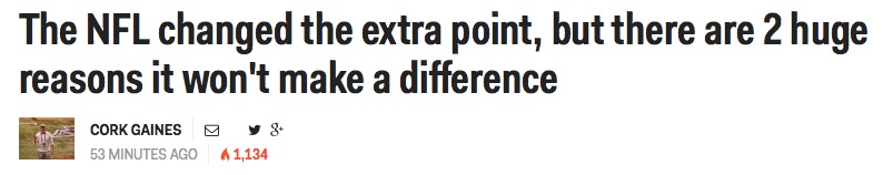 Wrong. They cite an expected ~97% extra point rate (based on 2014 field goals with the line of scrimmage from the 14-16). That’s still high and will usually lead risk-adverse coaches (not our very own big-balled marvel) to play it safe and go for one, not two – which over time would probably net just as many points – but it’s still over two points lower than the 99.6% rate on extra points the league had been experiencing. So it might not make a difference from a play-call standpoint, but there will absolutely be at least a few additional quirky scores thanks to the slightly decreased percentages.