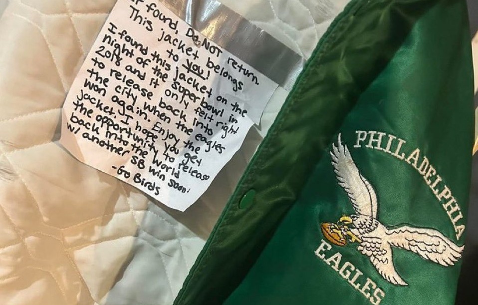 So the story here is that back in 2018, someone found an Eagles jacket that apparently had been left behind on the night of the Super Bowl win. This mystery person held on to the jacket until the next Super Bowl victory, which was two weeks ago, and released it back into the wild for someone else to find. Amy Rannabarger saw it hanging from a light pole at the Art Museum, so she is now the keeper of the jacket and tasked with releasing it when the Eagles win their next title, which will be February of 2026.