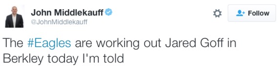 NFL scout John Middlekauff reports the Eagles are indeed working out Jared Goff at Cal today, explaining Doug Pederson and Howie Roseman’s flight to California, on which they were spotted by reader Ryan.