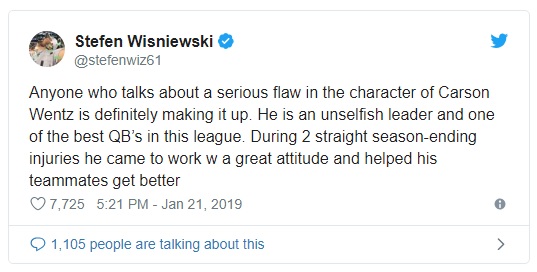 I wrote that up in a post titled “Josina Anderson’s Source,” with a necessary h/t to Brandon Lee Gowton at BGN. I don’t know if he’s her source or not, but it’s interesting to look at the puzzle pieces. Obviously now people are expecting Jeffery to defend Wentz from the Philly Voice story as PROOF that he supports the quarterback and was not the anonymous complainer.