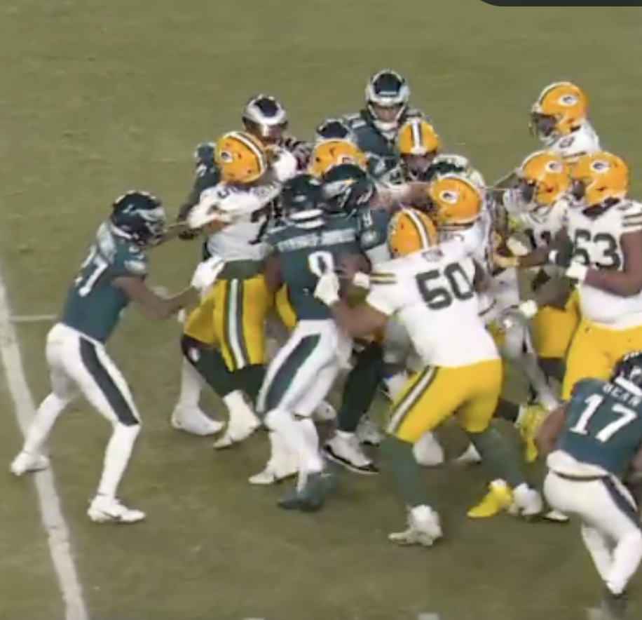 This would be a penalty if the Packers get their way because eight Packers are pushing six Eagles: