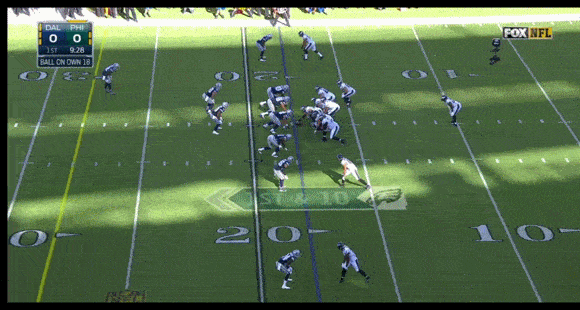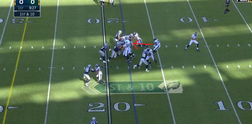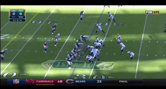 On the third play, a sweep left, Dallas ran a stunt that the Eagles couldn’t handle. Celek whiffed on his man, who couldn’t quite reach Sproles at the point of handoff but still disrupted and delayed the run. Then Kelce — despite a desperate lunge — couldn’t get in front of LB Sean Lee, who took advantage of the delay to swoop in and tackle Sproles for the loss. Ryan Mathews was also pretty much useless on the play.