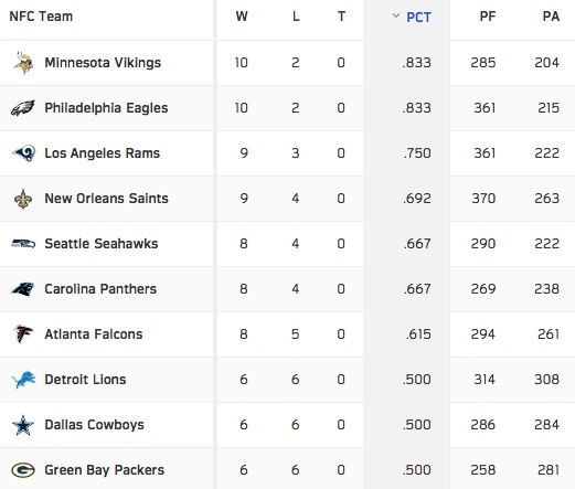 The beauty of the Saints’ loss is that an Eagles win on Sunday, to bring them to 11-2, would put them at least full two games ahead of the Saints, Rams (with tiebreaker), Seahawks, and Panthers (with tiebreaker), vastly increasing their odds of a first round bye, regardless of what the Vikings do. But, should the Vikings lose to the Panthers, then the Eagles would again have sole possession of first place over them and a sudden edge in the tiebreaker, because, momentarily, the Eagles would have the better conference record and better winning record among common opponents (Rams, Bears, Redskins and Panthers), thus negating the need for that pesky strength of schedule thing.