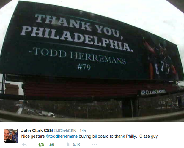Todd Herremans was released by the Eagles last week as one of the first casualties in this mass confusion that is the Eagles right now. The Toddfather, hero and viking, wasted no time in paying tribute to Eagles fans and thanking them for all of their support over his long tenure in Midnight Green by erecting that billboard above.
