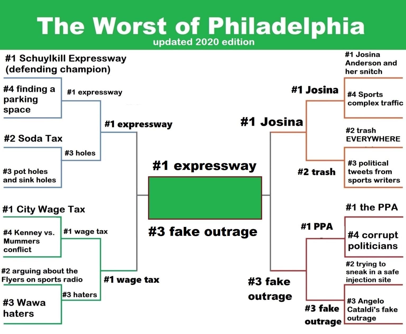 Alright let’s continue voting on our 2020 “Worst of Philadelphia” bracket. We’ve made it to the Final Four, which begins with an absolute behemoth of a matchup between #1 seeds. It’s the defending champion, the Schuylkill Expressway, vs. the loathsome city wage tax: