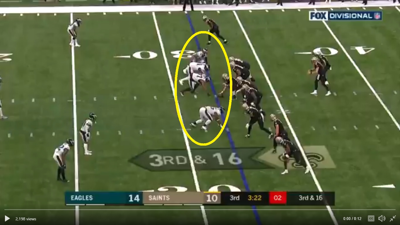 The thing that kills me about that play is that the Saints dropped eight guys into zone coverage. It was a three man rush, so you’ve got Lane Johnson 1v1 on the right and a pair of double teams elsewhere on the line. I know Nick isn’t a runner, but he could probably have climbed the pocket there or hit Wendell Smallwood in the flat. He saw something over the top and just didn’t put enough air under it, which is almost the opposite of what he did on the Matthews TD pass earlier in the game, which was a back-foot, “let me put it where my guy can get it” type of throw.