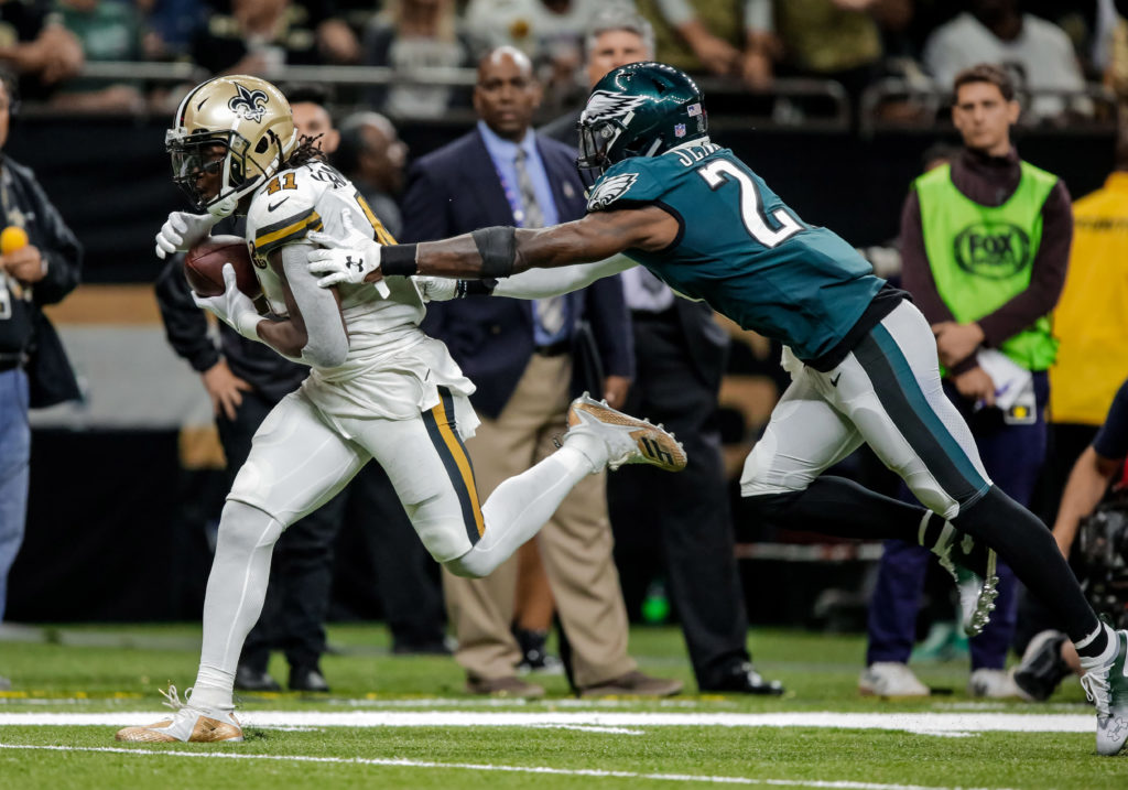 Nov 18, 2018; New Orleans, LA, USA; New Orleans Saints running back Alvin Kamara (41) catches a touchdown over Philadelphia Eagles safety Malcolm Jenkins (27) during the second half at the Mercedes-Benz Superdome. Mandatory Credit: Derick E. Hingle-USA TODAY Sports
