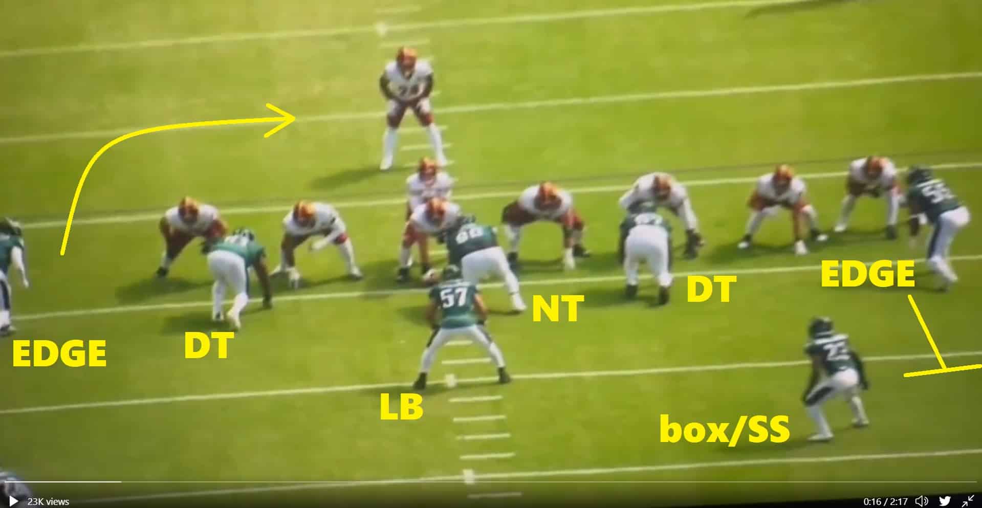 That second play specifically is nice to analyze because they gave us a back-angle replay where we were able to see the defensive line movements. As Baldy mentions, Haason Reddick rushes from the left side and Brandon Graham drops into coverage on the other side, but pre-snap, the deployment looks like this: