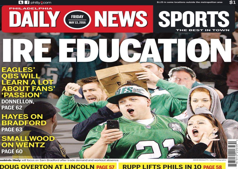 It’s fucking the middle of May. The Phillies won again last night thanks to an extra innings, bases-clearing double by Cameron Rupp. They’re tied for the 8th best record in baseball. It’s warm out. And this, this is the back page of the Daily News– a headline and series of stories propagating the notion that Philly is nothing but boorish clowns who will run anyone who dares to mess with the sanctity of their perennially underachieving football team out of town. For some, that’s true. For everyone else, Philly itself, thanks to slop like this from the Daily News, just fans the flames of idiocy by continually writing about THE QUATERBACK, talking about THE QUARTERBACK, commenting about THE QUARTERBACK. The media is so goddamn uninventive at times. People give me shit when there’s a lack of content on the site, but you know what, at least we’re original. Slow week? Sure, here’s a few stories on the future of streaming sports. We recorded a whole podcast on the subject. Is it as fun as talking about a Flyers Conference Finals run or whether the Phillies will be buyers at the deadline? No, but at least it’s different, original. 90% of the media just churns out the same shit, day after day, year after year. It’s all noise and filler. This Daily News cover is the perfect example. Be better, Philly.