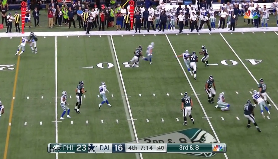 Doug’s East-West offense is bad enough, but throw in poor execution on a screen pass and a decision to line up Trey Burton (whom I actually like!) as a wide receiver on the biggest play of the game (until that point) and you have a recipe for failure. Your four minute offense – or just your offense in general – is supposed to move the ball forward. Every single play the Eagles ran on this drive had more lateral movement than vertical movement.