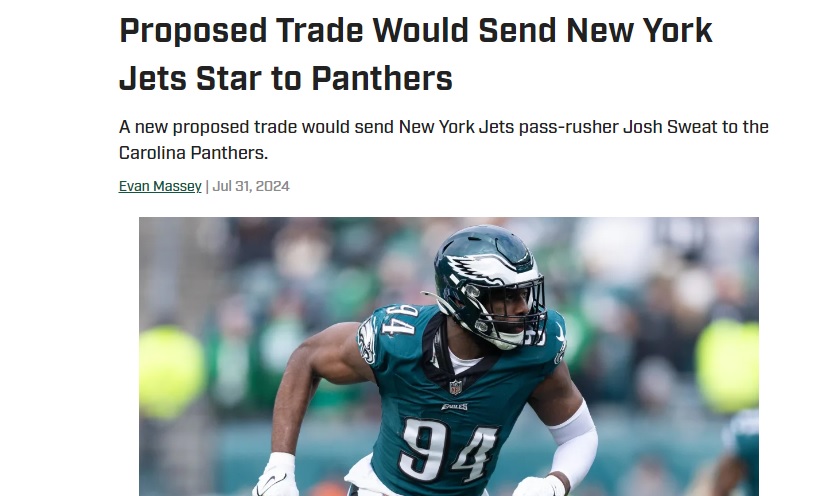 At Sports Illustrated, Evan Massey wrote a story titled “Proposed Trade Would Send New York Jets Star to Panthers.” The subtitle reads “A new proposed trade would send New York Jets pass-rusher Josh Sweat to the Carolina Panthers.”
