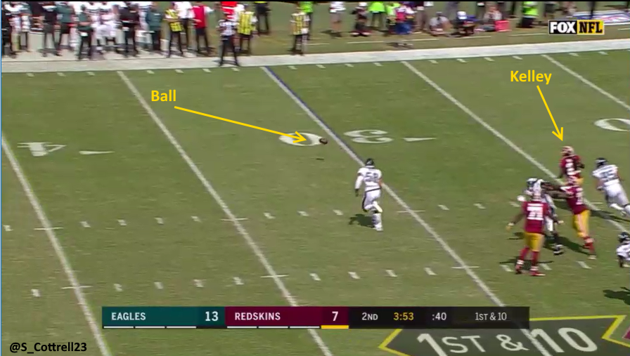 The next incident was the intentional grounding non-call on Washington. The Redskins attempted a screen pass to fat Rob Kelley, but Kelley got caught up in the trash along the line and was nowhere near the ball when it landed. Yet, Allen and his crew said Kelley was in the area. Do you see Rob Kelley?
