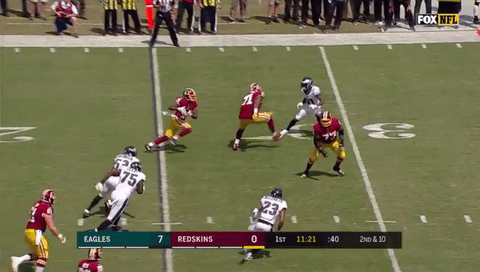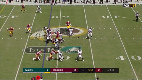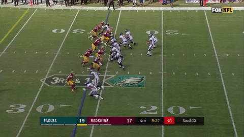 Wentz just calmly spins away, turns upfield and, in a move delightfully reminiscent of his touchdown throw to Darren Sproles in Week 3 against the Steelers in 2016, floats a perfect pass to Zach Ertz for a 23-yard gain. The Eagles ultimately punted on this drive, but this play bought the defense more time to catch their breath, changed the field position, and set up Donnie Long Ball’s beautiful punt which pinned the Redskins back on their one-yard line. This was a man’s play– not many NFL quarterbacks can make it. Wentz does it on the regular.