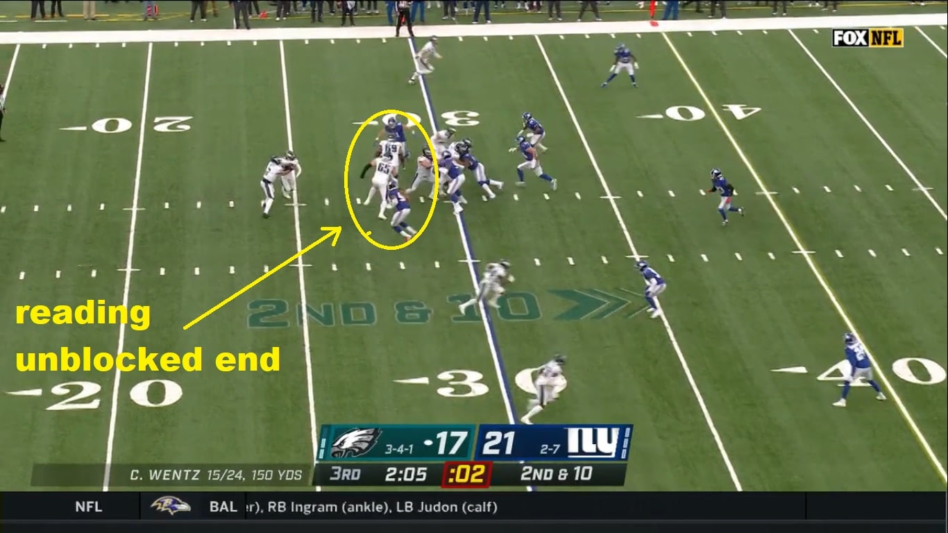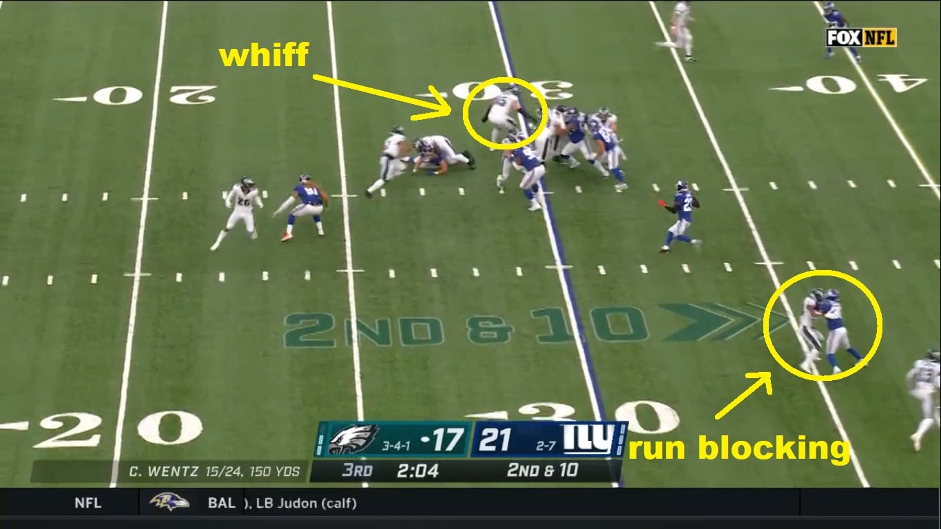 The receivers are run blocking, or just running half-assed dummy routes, because they know these plays are a joke. Lane Johnson totally whiffs on his guy and the Eagles take a one yard loss on a play that might have gone for one or two.