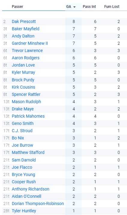 I went through the Sportradar data and filtered quarterback picks and fumbles to include weeks 5, 6, 7, and 8, and Dak Prescott led all quarterbacks in giveaways while Hurts isn’t even on the list: