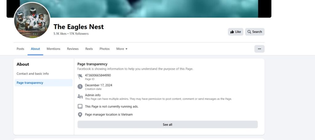 Funny enough, there’s a physical address in the Eagles Nest “about” section that reads 800 Virgil Ave, Los Angeles, CA 90029, United States. That’s the location of a Salvadoran restaurant in East Hollywood. The Facebook account’s phone number is also the restaurant phone number, yet in the “page transparency” section is says the account manager is located in Vietnam, so they just picked some random California restaurant as the fake address. We’ll have to call the Salvadorans in a few hours (it’s 7 a.m. there) and tell ’em their address is being used inappropriately.