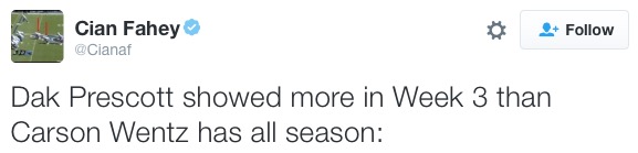 That’s it. That’s the only time Wentz is mentioned in the lengthy article. Clickbait at its finest, and for what reason? Did Fahey just want the clicks – and our collective scorn? – or does he actually believe that Prescott – medicore twice, really good once – has been more impressive than Wentz, who has done what Fahey is describing here in all three games. You’ve never seen a quarterback make pre-snap reads like that before, what, this season, when Carson Wentz pioneered that sort of thing? Fuckouttahere.