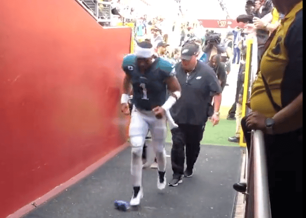 A lot was happening as Jalen Hurts was coming off the field Sunday. We had Big Dom holding up the new railing so this time it wouldn’t fall on our franchise QB, some guy threw a green rubber football to Jalen he misplayed, and then before he hit the tunnel a beer can almost clocks him in the dick! Everyone presumed it was some rogue Commies fan, jealous because his team doesn’t have a franchise QB: