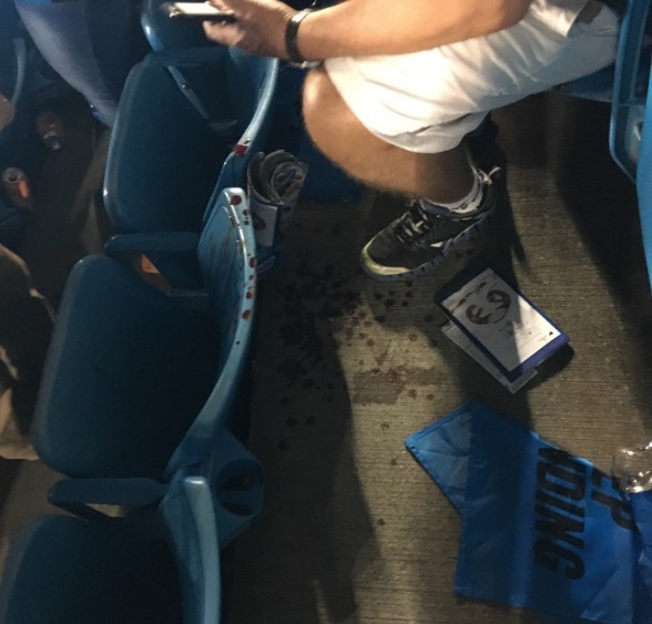 dude bro & his chicka were standing for the entire game. words gradually got more and more escalated. there previously was a single mom and her son between us, they left halfway through the 3rd. after that, the lid was off. the dude took offense to the couple never sitting down and obstructing his view. the victim telling the dude bro how they’re being jerks and how rude they are for not sitting. the dude bro turns around and calls the victim a “geriatric fuck”, “faggot”, and “hick”. then sucker punches him right in the face. i don’t know if he got away or left in handcuffs, but i hope it’s the latter.