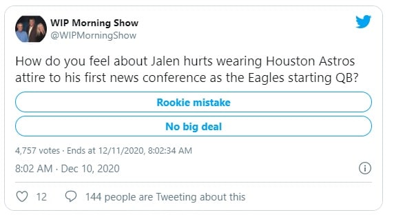 I’m going to give Jalen Hurts a pass this time when he spoke yesterday with his Astros tire. He doesn’t know Phila and fans yet. This is a no no but cause his concern was getting ready for his first start as #Eagles QB. Houston is home. But never again. @SportsRadioWIP pic.twitter.com/rf7NAOtw37