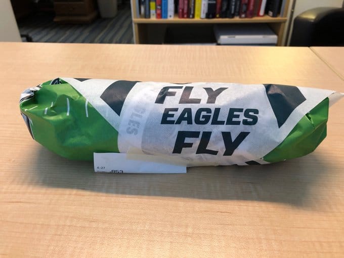 Hopefully this helps bring you back on board the Wawa train. A Washington radio host bought a sandwich in D.C. and it was presented in a Philadelphia Eagles-branded deli wrap: