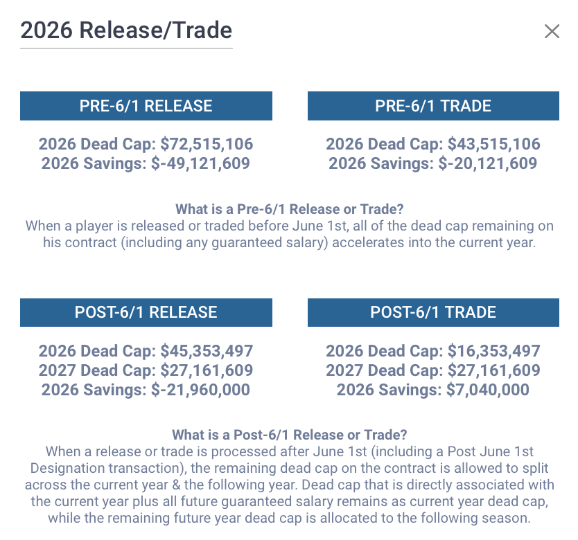 Without speaking above my pay grade or diving too deep into the salary cap weeds, there is no clean out on this deal. If the Eagles were to cut Brown tomorrow, they would take on a dead cap hit of $72.5 million for the 2026 season. If they were to wait until after the new league year officially starts on June 1st, this number goes down to $45.4 million in dead cap for 2026 as well as a $27.2 million hit in 2027.