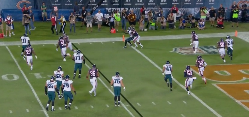 I can’t recall more than one bad throw. Everything is on the money. Wentz doesn’t make mistakes. He doesn’t force things. Take that first drive, for example– he easily could’ve tried to force something on third and goal – say, a backhand shovel scoop to Trey Burton? – but he didn’t and calmy scampered out of bounds and took the easy three points. I’d wager that most rookies, and many vets – especially that chain-smoking goof Jay Cutler, who was out there like a quarterback in NFL Street just mashing buttons trying to make something happen – would try to force a throw there or do something foolish and try to break for the end zone.