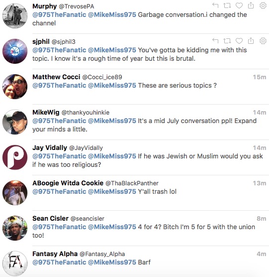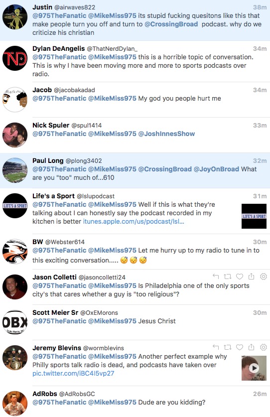 Yeah they’re missing the point. It doesn’t matter which side of the contrived debate Mike falls on, the collective eye-roll has to do with the fact that anyone would even consider this a worthy topic. I know I sound like a broken record, but who on Earth, given the choice, would choose that conversation over literally any podcast discussing something that interests them? I don’t care if it’s sports, rock, tech, politics, religion, news, comedy, EROTICISM– doesn’t matter. Everyone has some interest that can be better served than by listening to meatheads debate Carson Wentz’s religion. Never mind the fact that, somehow, this was never a topic when Brian Dawkins, the savior himself, was spouting off platitudes before bashing his own head. I’m sure if Carson Wentz cited the book of Job before running through a cement wall he’d get a pass from the hardened ilk of Philly sports talk radio. Fuck this is dumb.