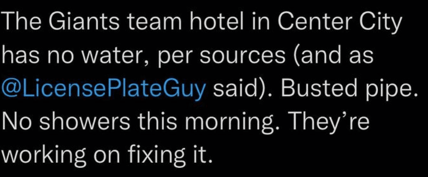 The Giants team hotel in Center City has no water, per sources (and as @LicensePlateGuy said). Busted pipe. No showers this morning. They’re working on fixing it. #giants #eagles