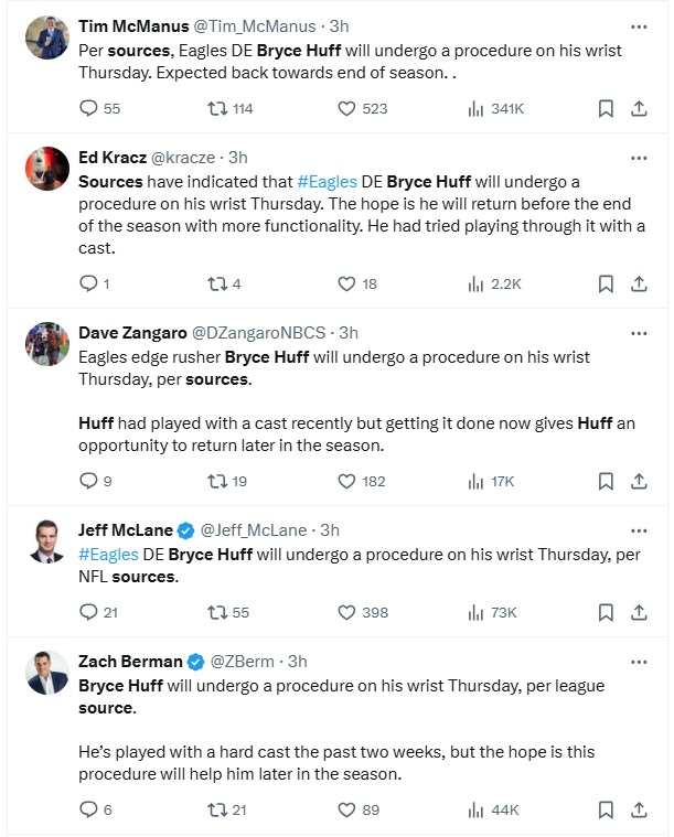 Bryce Huff will miss time with his wrist injury. That’s according to all of the beats, who MYSTERIOUSLY tweeted the same thing at the same time, citing a “source” –