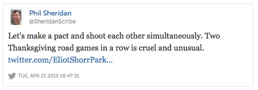 The Eagles will play the Lions at 12:30 on Thanksgiving Day. It’s the second year in a row the Birds will play on Thanksgiving, and predictably, the scriptuals aren’t too happy about it (nor is Derrick Gunn, who lamented about his holiday plans endlessly on Breakfast on Broad this morning). Quite frankly, I don’t blame them (I wouldn’t want to go to Detroit on Thanksgiving… or ever). But this provides a nice illustration of the difference in mindset between fans and reporters. Fans see: OMG another Thanksgiving Day game. AWESOME! I love football and the NFL sooooo much. Writers see: FML. Goddamn schedule makers are out to get us. I’ve always hated football on holidays. When will they end this charade? Me? I love the prospect of flipping over from the 6 ABC Boscov’s Thanksgiving Day Parade straight into EAGLES FOOTBALL! I’m gonna need my stuffing and then maybe a little bit of that turkey gravy poured on top… yep, just like that. Thanks!
