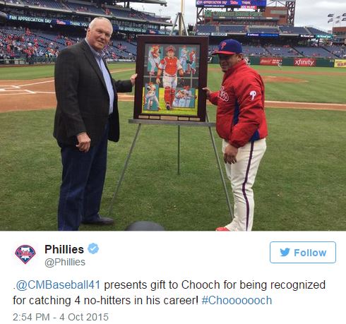 Before the game, the Phillies honored Chooch for catching four no-hitters, but Roy Halladay did them one better: