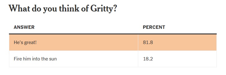 This feels high? Or maybe not. Maybe social media is generally grumpy and therefore negative towards the Gritster, but the subscriber portion of Flyers fans overwhelmingly think that Gritty is great. 81.8% is a landslide, the type of numbers a Democrat typically pulls in Philadelphia.
