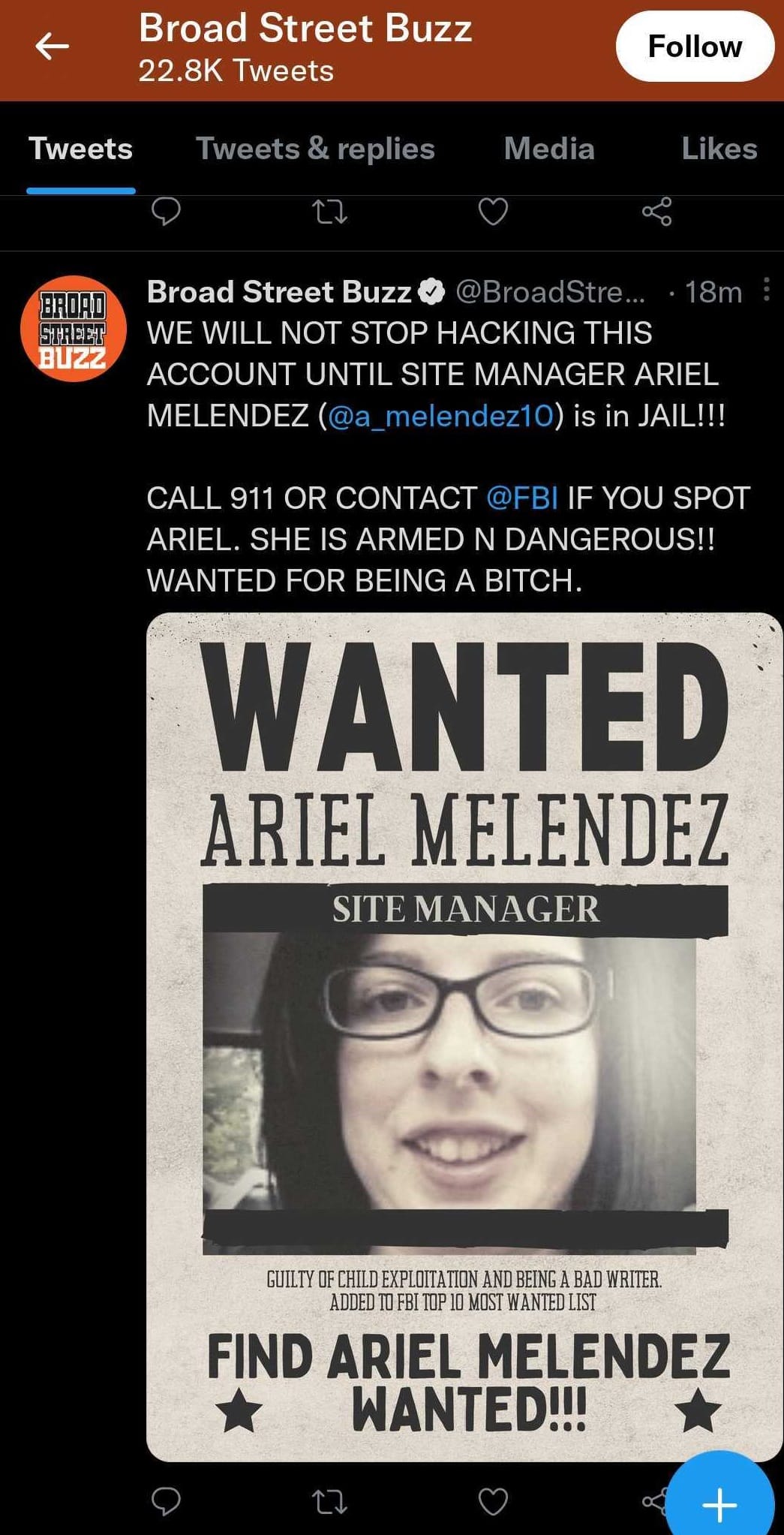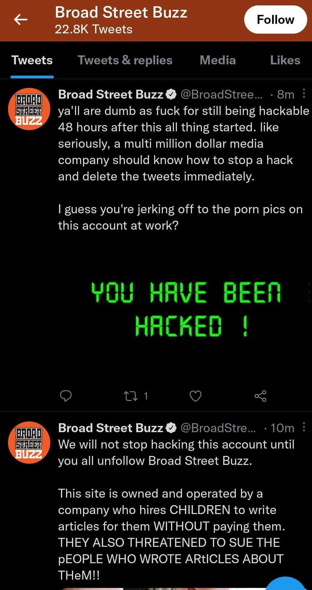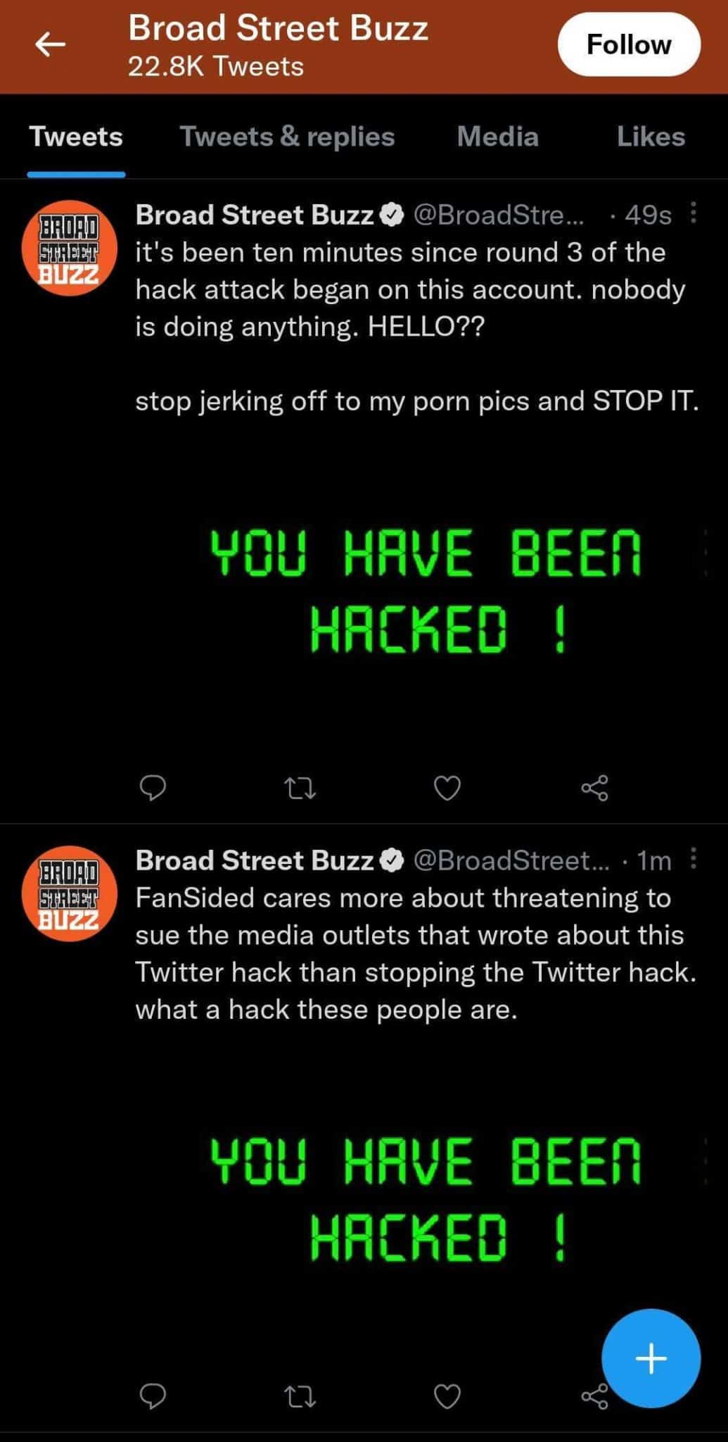 If you missed it the other day, the Twitter account for Flyers blog Broad Street Buzz was hacked and/or taken over by a disgruntled (maybe former) employee. For 10+ hours, the account posted nothing but pornography and feet pics while criticizing owner FanSided and directing readers to go to Broad Street Hockey instead. Eventually the Twitter account was deactivated.