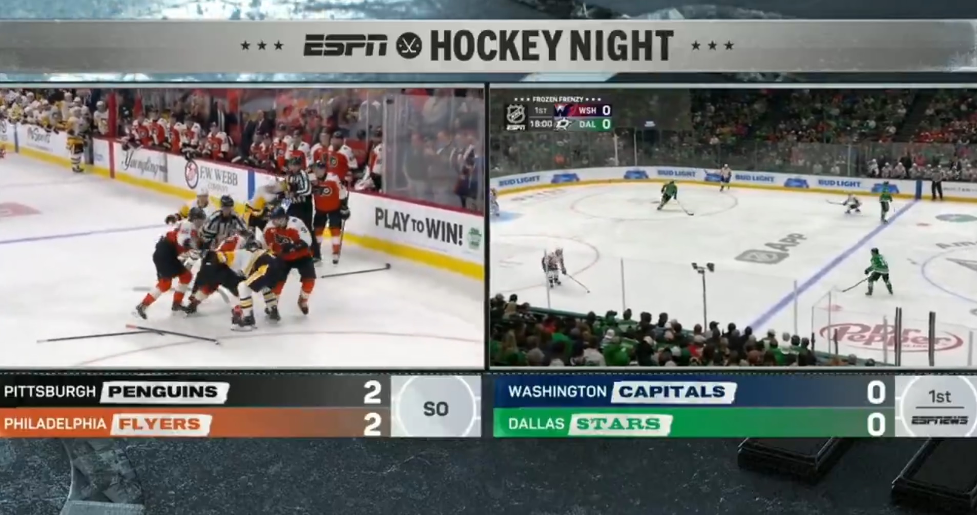One of the things with the Frozen Frenzy schedule is that the league stuffs so many games into the schedule that obviously there’s significant overlap. In this case, on the ESPN main channel, it was Flyers/Yinzers at 6, Caps/Stars at 8:30, and then Kings/Sharks at 11:00 p.m. Everything else was on the ESPN app, which included eight games that were taking place at the same time as Flyers/Pens. Surely they just could have run a crawl at the bottom saying “Capitals vs. Stars is airing on ESPN+ , for the five people who care.” Then you just switch it over to the main channel after the Fly Guys take out the trash. Why didn’t they do that? Did we get any explanation? One one hand, not everyone has the ESPN app, so whereas you might bump something from ESPN to ESPN 2 on a typical cable setup, this Caps/Stars game might have been inaccessible entirely for some customers. No clue, just taking a guess. Maybe it was in the broadcast guidelines that they weren’t allowed to do that.