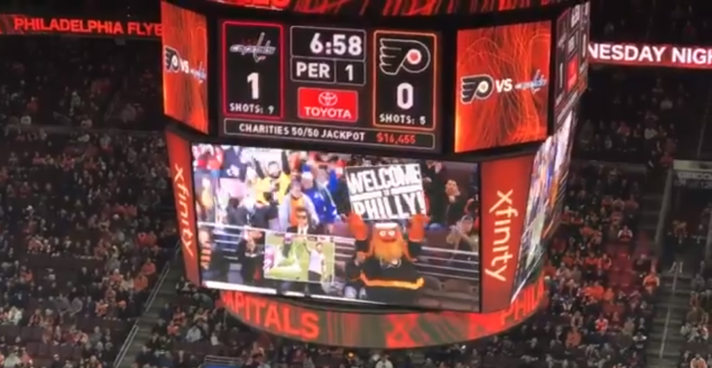 During the first period of the Flyers’ 5-3 loss to the Washington Capitals last night, the home team welcomed Phillies outfielder Bryce Harper (still feels good to write that – real good) to Philadelphia: