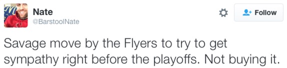 Of course, the irony is that this all probably will inspire the Flyers, and Nate – easily Barstool’s least funny blogger – will be forced to blog #WinForEd as it blows its way through the Nation’s Capital like the DC Madam. I’m so fucking Flyer’d up right now.