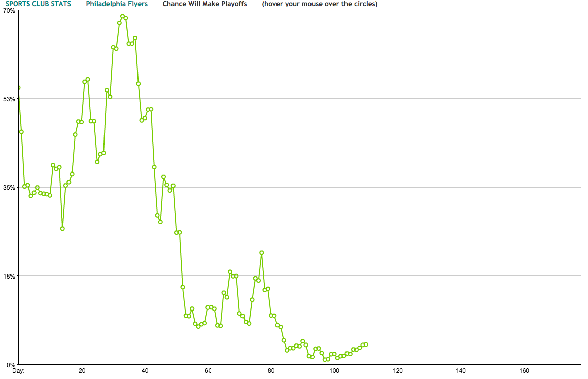 Right now, the Flyers aren’t a playoff team. If the season ended today, they’d finish nine points out of a playoff spot. They have a 3.9% chance to make the playoffs, and that’s on a slight uptick (after a significant drop):