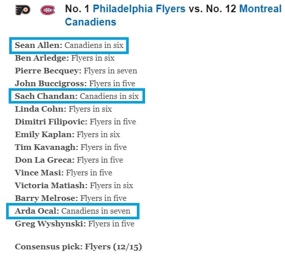 Take this article at ESPN, for instance, where 12 of their hockey experts pick the Flyers to win in five, six, or seven games, but three folks are riding with Montreal instead: