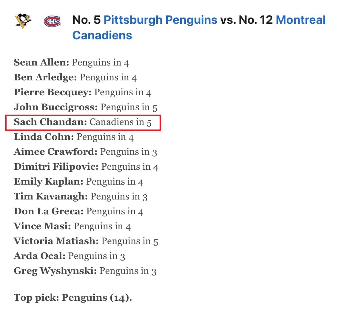 The only thing making me nervous is that this Chandan guy picked the Habs over the Penguins and got it right. He was the only person in the group to do it: