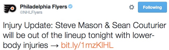 The Flyers announced this morning that Steve Mason will miss the game against MIKE RICHARDS’ CAPITALS tonight due to a lower-body injury (we don’t know if it’s actually his groin or something else resulting from the fact that he’s made of loosely-intertwined noodles). It is, perhaps, the most mundane and trivial bit of news that can possibly be released by a team lacking a clear number one goalie. But it enraged the collective group of asshats who cover the Flyers on a daily basis.