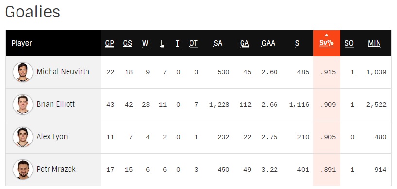 The Flyers’ goaltenders… do not have a good combined save percentage this year.