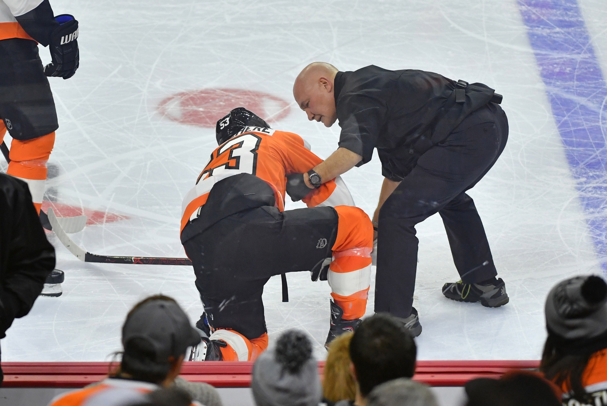 Shayne Gostisbehere is helped off the ice by Jim McCrossin in a 2018 home game (Eric Hartline-USA TODAY Sports)