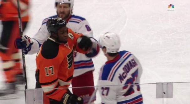 In the aftermath, Simmonds engaged McDonagh in front of the Rangers bench. Following a moderate slash by Simmonds to the Ranger player’s shin pad, McDonagh pushed back with a shove across Simmonds’ midsection, creating some separation between the two players.