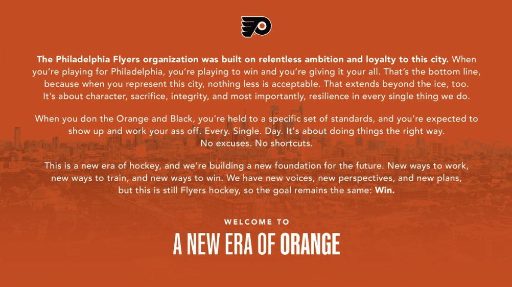 Imagine the Eagles releasing something like this. I can picture Jeff McLane having to raise his hand and ask Howie what exactly are the new ways you plan on winning. I want to say they’re trying to shed the Broad Street Bullies toughness mantra, which I’m all for if true, but the statement is so contradicting that I can’t understand what it is fully trying to convey. I think most Flyers fans would be happy if they didn’t hear from the team all summer.
