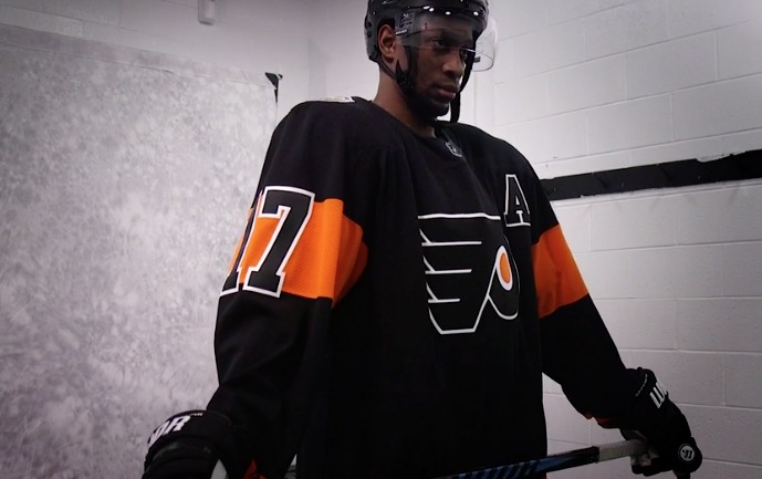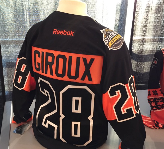 The new jersey stands as a contemporary homage to the unique characteristics of 50 years of the Flyers uniform – a bold design for a passionate city. The primary color of the uniform is black, fiercely showcasing the traditional winged-P on the chest. The single dominant orange bands are a reinterpretation of the singular bands of color on the team’s current home and away uniforms. In addition, these bands of color are complemented by a contrast color name-plate, which is a signature design feature of the Flyers’ NHL uniform.