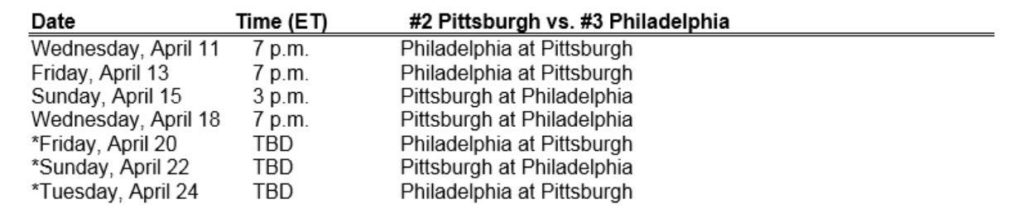 The series will begin Wednesday night at 7 PM in Pittsburgh. Everything else depends on tonight’s Florida-Boston game.