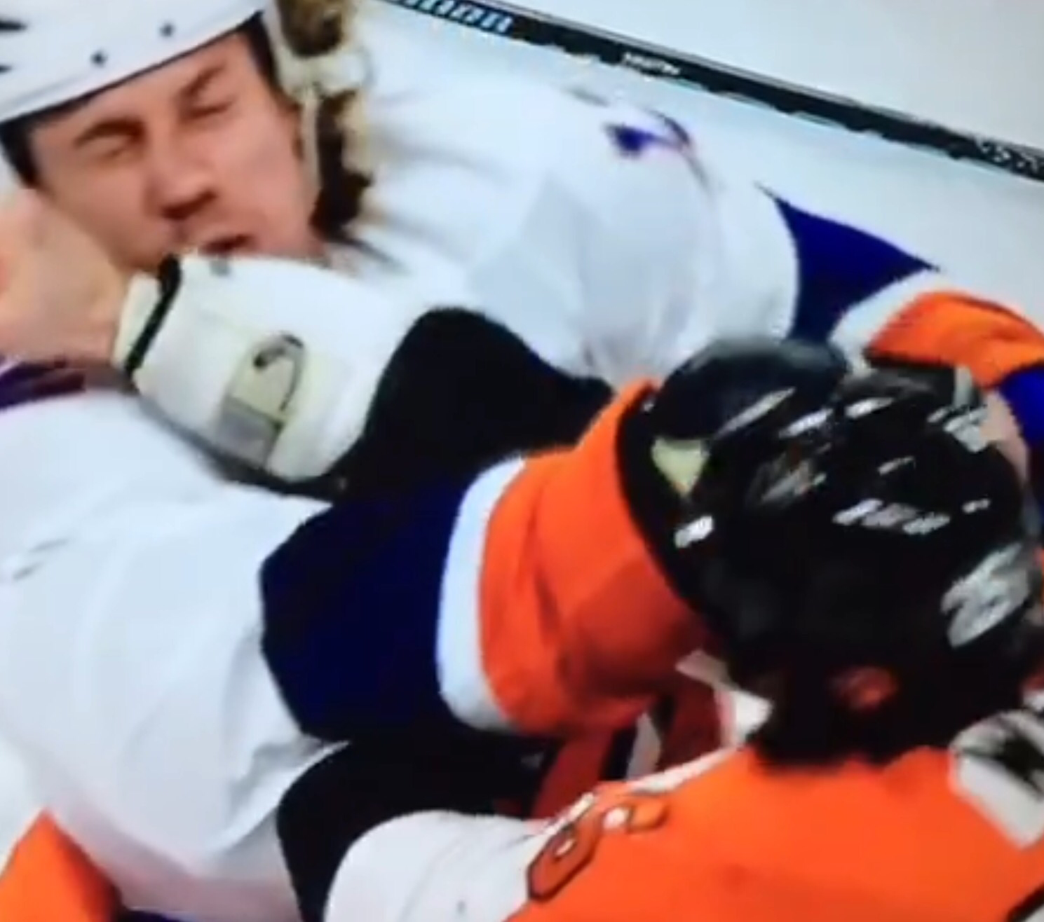 Here’s video of Ryan White breaking Matt Martin’s nose with a punch. Pretty sure this is what it looks like every time Rod Brind’Amour blows his nose.